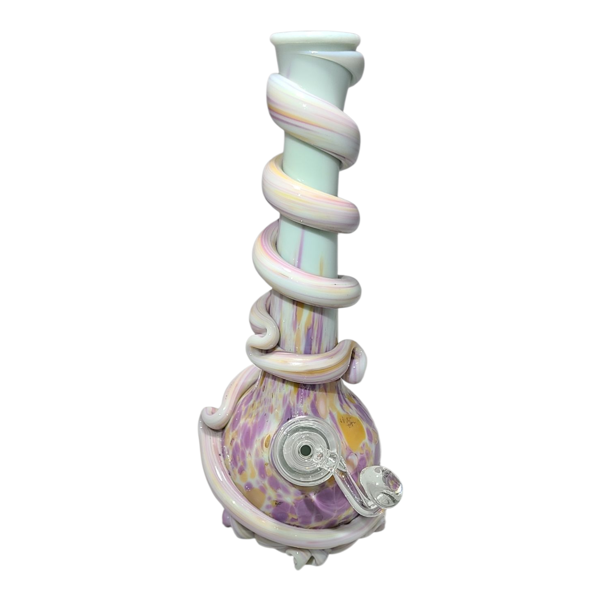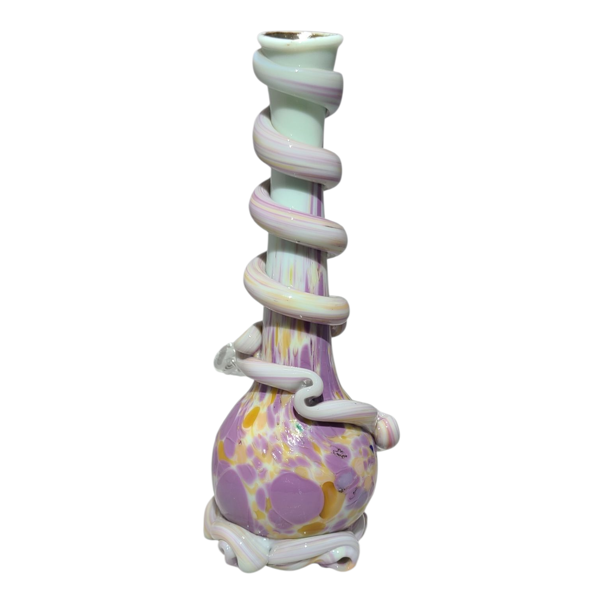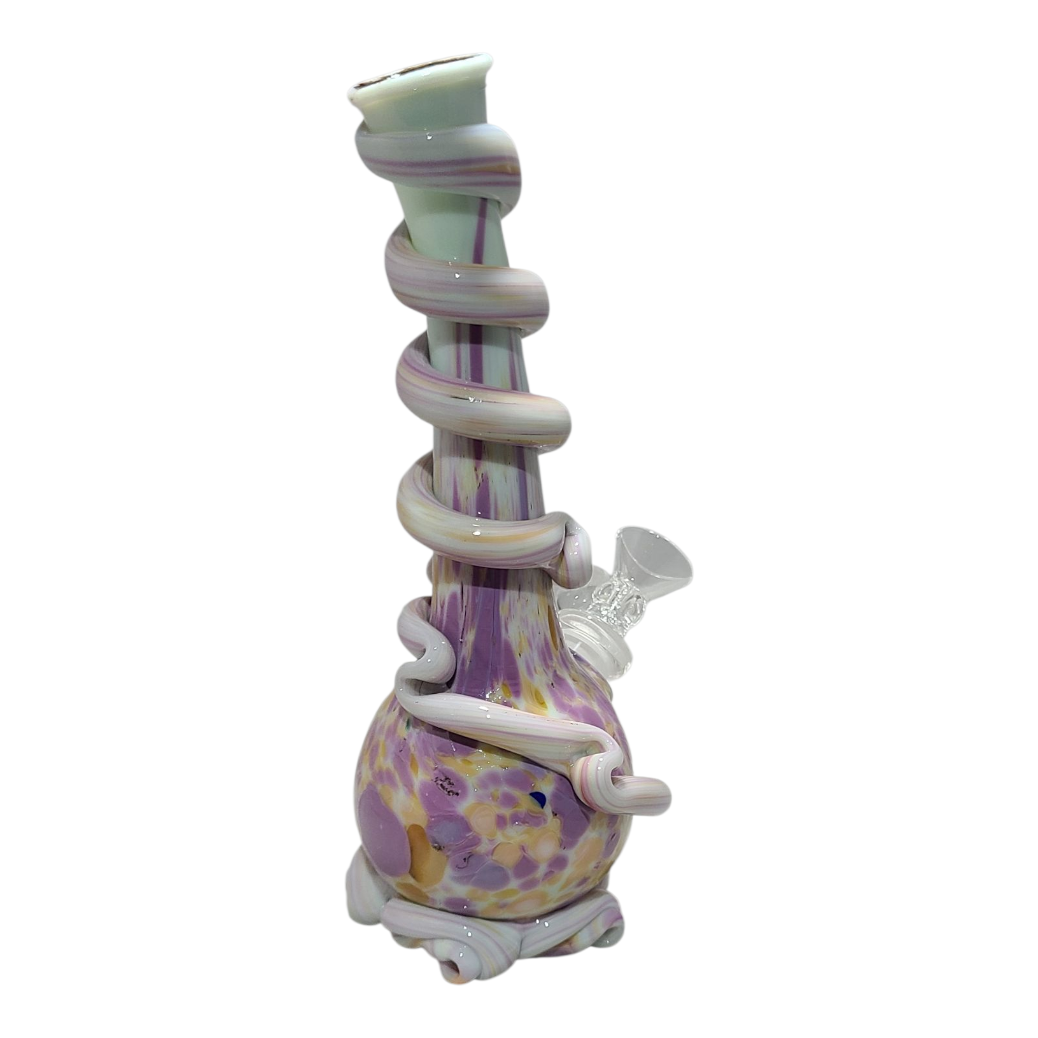Beautiful pinks, purples, and light orange-brown over white waterpipe with deluxe wrapped neck and foot. Includes removable downstem and martini bowl with handle.